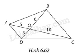 \(\begin{array}{l}\frac{{AO}}{{CO}} = \frac{5}{{10}} = \frac{1}{2}\\\frac{{DO}}{{BO}} = \frac{3}{6} = \frac{1}{2}\\ = > \frac{{AO}}{{CO}} = \frac{{DO}}{{BO}} = \frac{1}{2}\end{array}\)