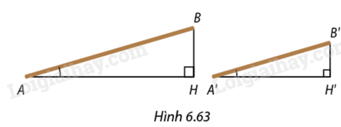 Trong Hình 6.63, hai đường ram dốc \(AB\) và \(A'B'\) có cùng tỉ số chiều cao và chiều dài \(\frac{{BH}}{{AH}} = \frac{{B'H'}}{{A'H'}}.\) Em hãy giải thích vì sao \(\widehat A = \widehat {A'}.\)