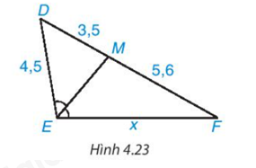 \(\dfrac{{E{\rm{D}}}}{{EF}} = \dfrac{{M{\rm{D}}}}{{MF}}\) hay \(\dfrac{{4,5}}{x} = \dfrac{{3,5}}{{5,6}}\)