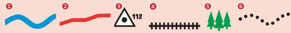 Có một số biểu tượng trong chú thích. Một khu vực có cây xanh là rừng, và đường màu xanh là sông. Một đường chấm đen là một tuyến đường. Có một hình tam giác nhỏ màu đen và một con số cho một ngọn đồi. Con số - ví dụ 112 - có nghĩa là ngọn đồi cao 112 mét. Đường màu đỏ là con đường và đường sắt là đường màu đen với các đường nhỏ hơn trên đó. Một vòng tròn màu đen trên đường sắt là một nhà ga xe lửa. Khu vực màu đỏ là thành phố hoặc thị trấn. Bên cạnh khu vực màu đỏ là tên của thành phố.