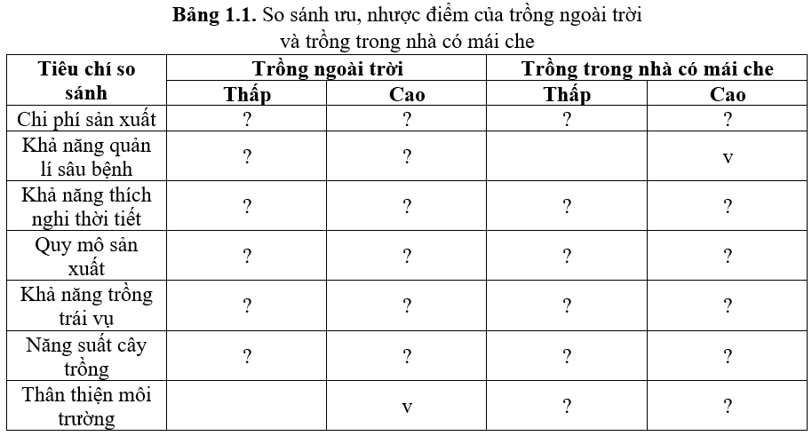 1. Trồng ngoài trời có thể gặp những vấn đề gì? 2. Trồng trọt nhà có mái che khắc phục những vấn đề đó như thế nào? 3. So sánh ưu, nhược điểm của phương thức trồng ngoài trời và phương thức trồng trong nhà có mái che theo mẫu Bảng 1.1 |