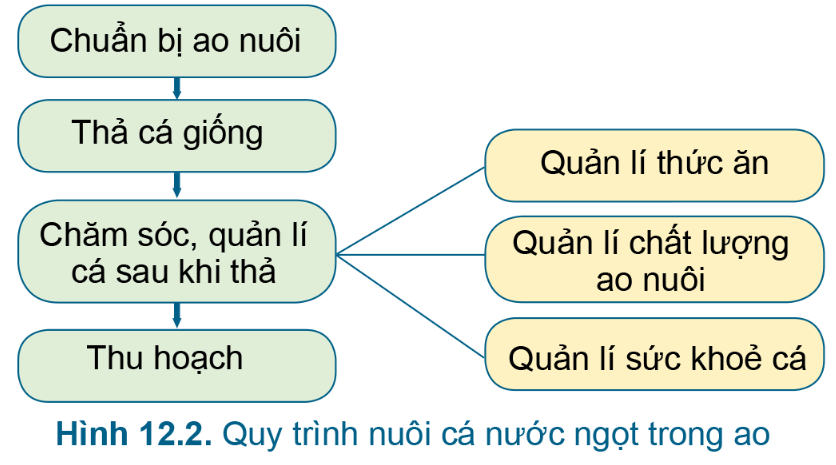 Em hãy nêu quy trình nuôi cá nước ngọt trong ao ở Hình 12.2.