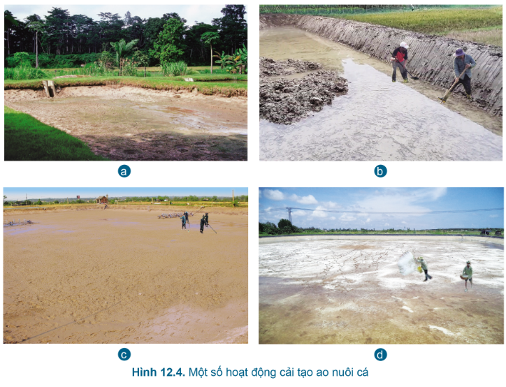 Hãy mô tả các hoạt động cải tạo ao nuôi trong Hình 12.4 |