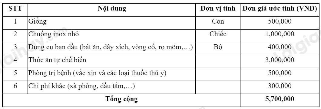 Nam có ý định nuôi một loại vật nuôi trong gia đình. Em hãy giúp Nam lựa chọn loại vật nuôi phù hợp và lập kế hoạch, tính toán chi phí nuôi dưỡng, chăm sóc trong năm đầu. |