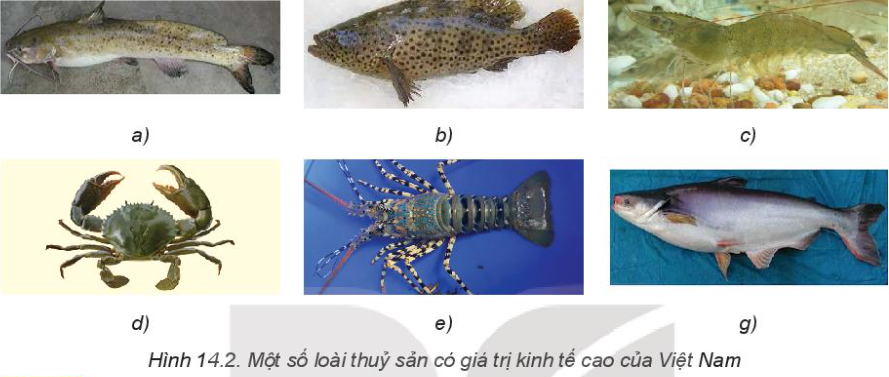 Quan sát Hình 14.2 và sử dụng các từ sau đây: tôm thẻ chân trắng, cá tra, cá song, cá lăng, cua biển, tôm hùm để ghép tên các loài thủy sản có giá trị kinh tế cao của Việt Nam vào từng ảnh cho phù hợp.