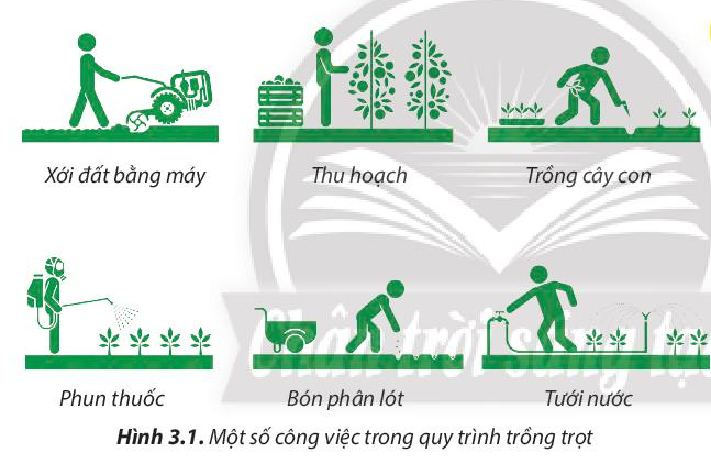 Quan sát vào hình 3.1 ta thấy các công việc trong quy trình trồng trọt, cụ thể là: xới đất bằng máy, thu hoạch, trồng cây con, phun thuốc, bón phân lót, tưới nước.