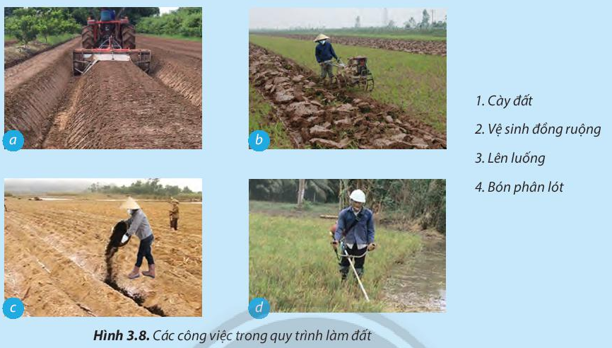 Quan sát vào hình 3.8 ta thấy các công việc trong quy trình làm đất, bao gồm: hình a – lên luống, hình b – cày, hình c – bón phân, hình c – cắt cỏ