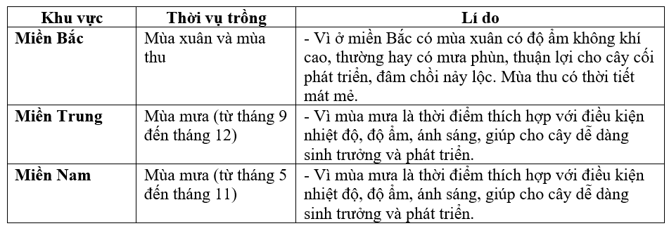 Đề xuất thời vụ trồng cây phù hợp cho ba miền và giải thích lí do theo mẫu Bảng 5.1: |