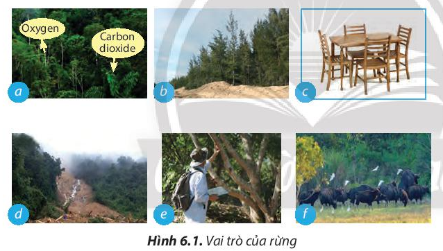 Quan sát vào hình 6.1 ta thấy các vai trò của rừng như hình a – hít cacbonic và thải Oxy; hình b - chống cát, chắn gió; hình c – làm bàn ghế; hình d – chống xói mòn, sạt lở đất; hình e – phục vụ nghiên cứu; hình f – môi trường sống của nhiều loài vật.