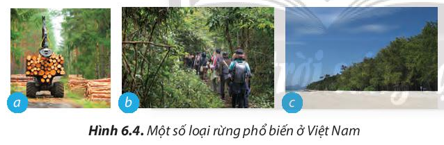 Quan sát vào hình 6.4 ta thấy hình a – khai thác gỗ trong rừng, hình b – đoàn người đang đi thám hiểm, nghiên cứu trong rừng, hình c – rừng mọc trên triền cát trắng.