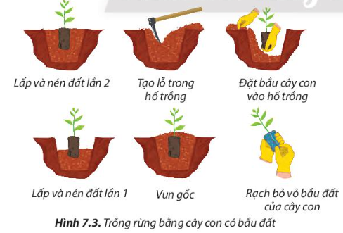 Quan sát vào hình7.3 ta thấy các bước trong phương pháp trồng cây bằng bầu đất