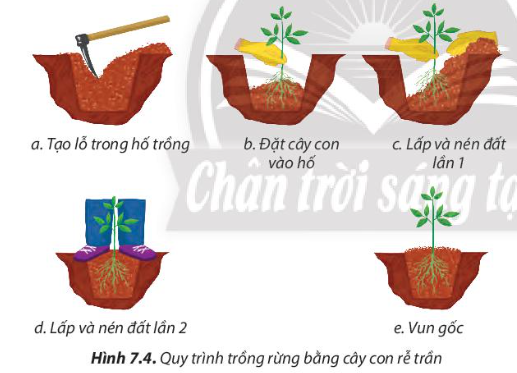 Quan sát vào hình 7.4 ta thấy quy trình trồng rừng bằng cây con rễ trần bao gồm 5 thao tác là tạo lỗ trong hố trồng; đặt cây con vào hố; lấp và nén đất lần 1; lấp và nén đất lần 2; vun gốc.