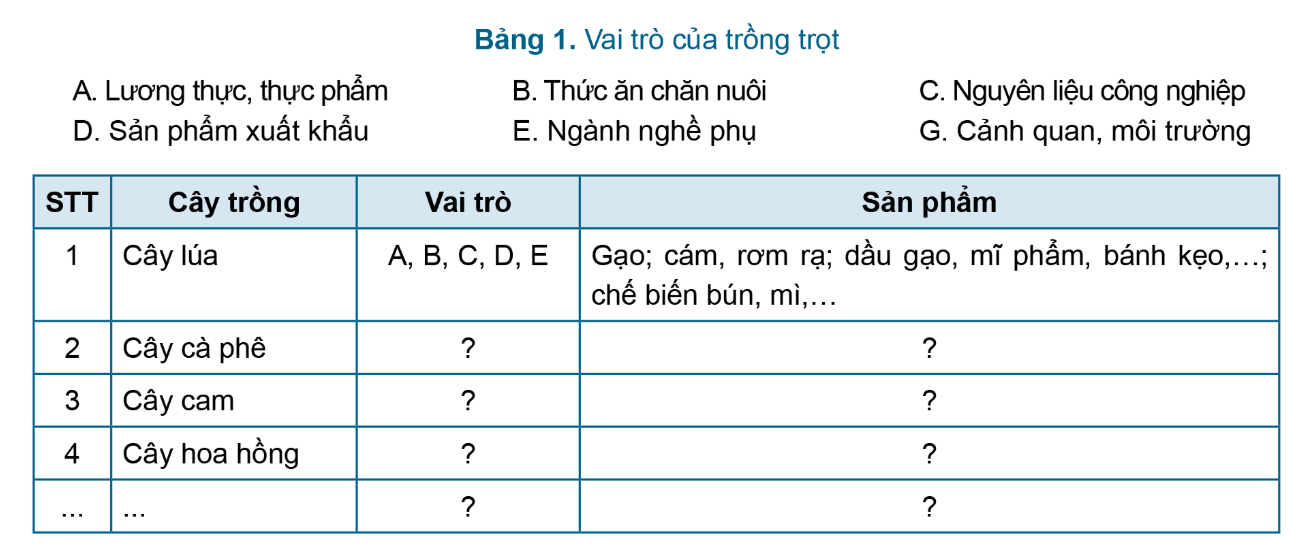Em hãy cho biết vai trò của một số loại cây trồng sau ( và cây trồng khác mà em biết ) theo mẫu ở Bảng 1. |