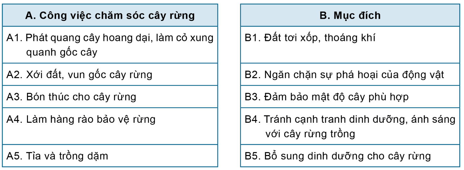 Ghép các ý ở cột A với cột B để xác định mục đích của công việc chăm sóc cây rừng. |