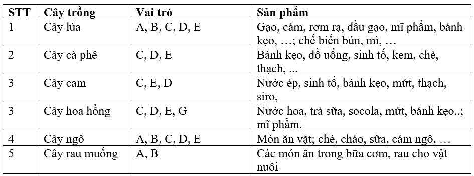 Em hãy cho biết vai trò của một số loại cây trồng sau ( và cây trồng khác mà em biết ) theo mẫu ở Bảng 1.