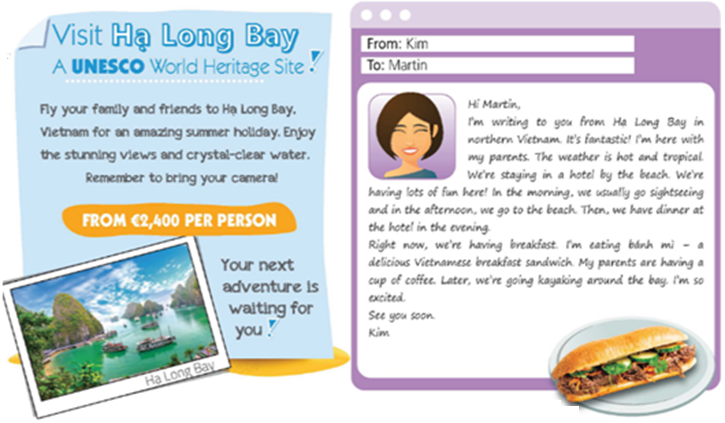 Xin chào Martin, tôi viết thư cho bạn từ Vịnh Hạ Long, miền Bắc Việt Nam. Thật tuyệt vơi! Tôi ở đây với bố mẹ tôi. Thời tiết nóng và nhiệt đới. Chúng tôi đang ở trong một khách sạn bên bờ biển. Chúng tôi đang ở đây rất vui! Vào buổi sáng, chúng tôi thường đi ngắm cảnh và buổi chiều, chúng tôi đi biển. Sau đó, chúng tôi ăn tối tại khách sạn vào buổi tối.