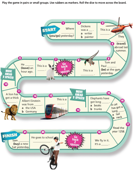 (Chơi trò chơi theo cặp hoặc nhóm nhỏ. Sử dụng tẩy làm điểm đánh dấu. Lăn xúc xắc để di chuyển trên bàn cờ.)