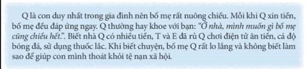 - Q vướng vào tệ nạn xã hội vì: được bố mẹ rất nuông chiều, khi xin tiền đều được bố mẹ đáp ứng ngay. Vì vậy Q bị bạn rủ rê, lôi kéo chơi điện tử, cá độ bóng đá và sử dụng thuốc lắc.