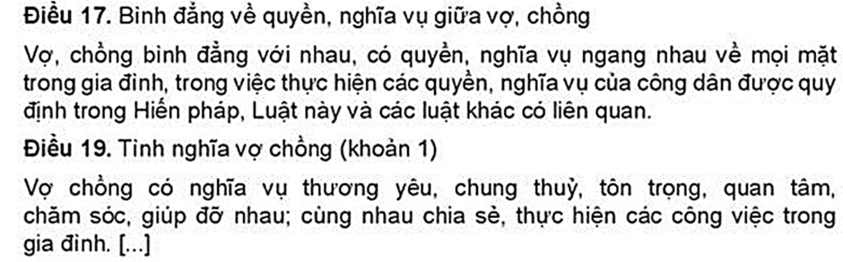 b) Vợ, chồng bình đẳng với nhau, có quyền, nghĩa vụ ngang nhau về mọi mặt trong gia đình; vợ chồng có nghĩa vụ thương yêu, chung thủy, tôn trọng, quan tâm, chăm sóc, giúp đỡ nhau; cùng nhau chia sẻ, thực hiện các công việc trong gia đình;...
