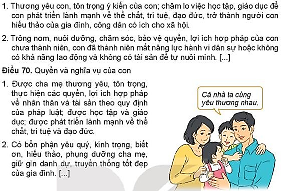 - Con có bổn phận yêu quý, kính trọng, biết ơn cha mẹ; có nghĩa vụ chăm sóc, phụng dưỡng cha mẹ và tham gia công việc gia đình phù hợp lứa tuổi; giữ gìn danh dự, truyền thống tốt đẹp của gia đình;..
