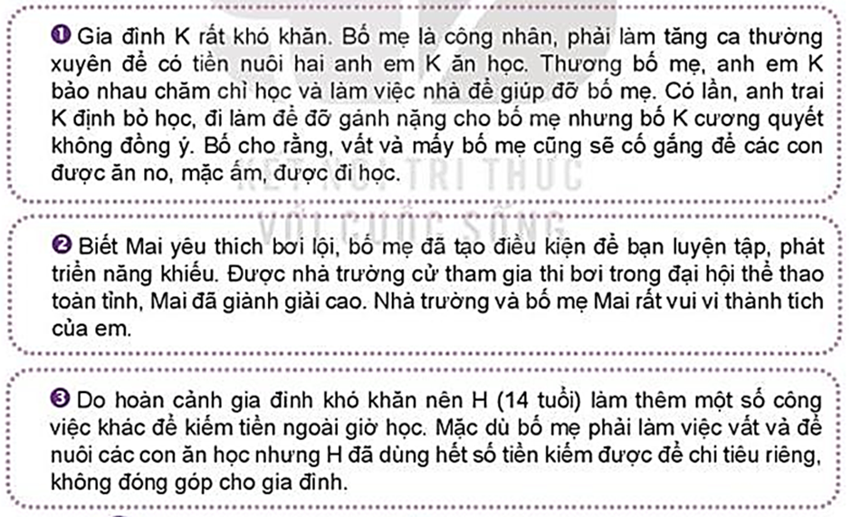 - Trường hợp 1: Nói về quyền và nghĩa vụ của cha mẹ nuôi dạy con thành công dân tốt. Bố mẹ K đã thực hiện đúng khi dù hoàn cảnh có khó khăn cũng vẫn cố gắng lo cho con được đi học.