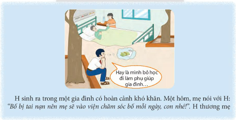Nguyên nhân gây căng thẳng cho H: gia đinh có hoàn cảnh khó khăn, bố H bị tai nạn nên mẹ bạn vào viện chăm sóc bố mỗi ngày. Mẹ phải gánh vác mọi thứ trong gia đình nên bạn thương mẹ. Vì không dám xin tiền học nên H đã cảm thấy rất mặc cảm và tự ti về bản thân và bạn có ý định bỏ học để phụ giúp mẹ