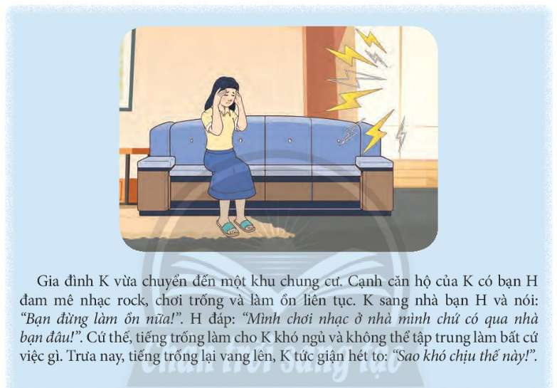 - K trở nên tức giận và dễ nóng tính bởi vì: cạnh nhà bạn K có bạn H đam mê nhạc rock, đánh trống làm ồn ào, ảnh hưởng đến cuộc sống hằng ngày của bạn.
