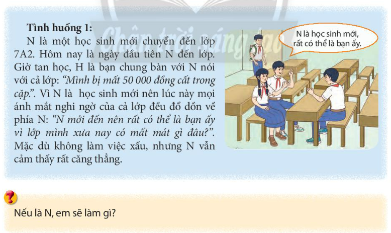 Nếu là N, em sẽ bình tĩnh nói với cả lớp báo với giáo viện chủ nhiệm để xử lí sự việc này. Em sẽ đồng ý cho bạn xét cặp của em để các bạn không còn nghi ngờ nữa.