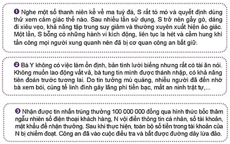 - Đọc trường hợp và nêu nguyên nhân, hậu quả của những tệ nạn xã hội trong các trường hợp trên.