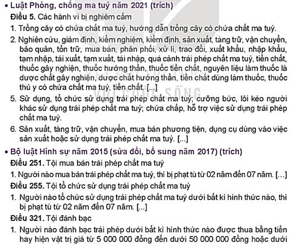 - Đọc một số quy định của pháp luật về phòng, chống tệ nạn xã hội và cho biết biết hành vi tẩm ma túy vào thuốc lào để hút của các học sinh ở thông tin 1 (mục 1) có vi phạm không?