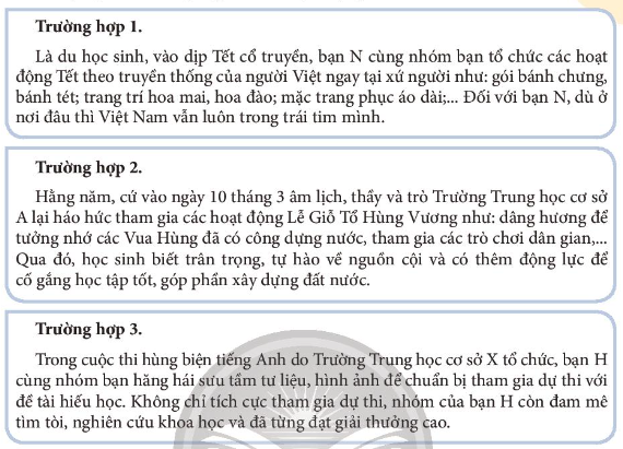 + Trường hợp 1. Bạn N trân trọng những giá trị văn hóa truyền thống của Việt Nam; dù là du học sinh, đang học tập tại nước ngoài, nhưng N vẫn cùng nhóm bạn tổ chức các hoạt động Tết theo truyền thống của người Việt ngay tại xứ người.
