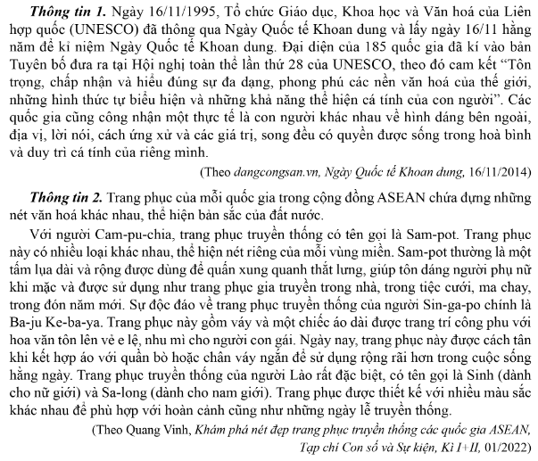 - Trong thông tin 1: Sự đa dạng của các dân tộc và các nền văn hóatrên thế giới được biểu hiện ở chi tiết: Các quốc gia cũng công nhận một thực tế là con người khác nhau về hình dáng bên ngoài, địa vị, lời nói, cách ứng xử và các giá trị, song đều có quyền được sống trong hòa bình và duy trì cá tính của riêng mình.