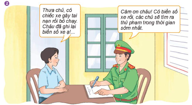- Trong bức ảnh 2: Bạn học sinh nam đã đến trụ sở công an để: trình báo, tố cáo, cung cấp bằng chứng về sự việc một chiếc xe gây tai nạn rồi bỏ chạy.