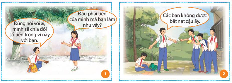 + Bức tranh 1: bạn học sinh nữ từ chối lời đề nghị chia đôi số tiền trong chiếc ví mà bạn học sinh nam nhặt được; đồng thời, khẳng định: không nên chiếm đoạt số tiền nhặt được vì đó không phải là tiền do bản thân mình làm ra.