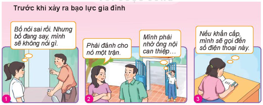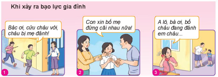 - Bức tranh 3: Khi xảy ra bạo lực gia đình, bạn học sinh nữ đã nhờ sự trợ giúp, can thiệp của người thân.