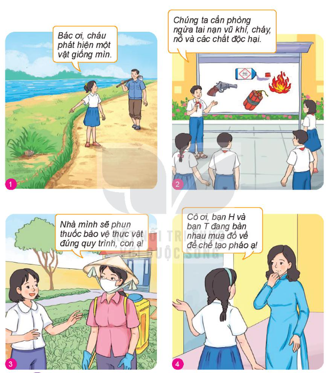 a) Em hãy cho biết những nhân vật trong các bức tranh trên đã làm gì để phòng ngừa tai nạn vũ khí, cháy, nổ và các chất độc hại.
