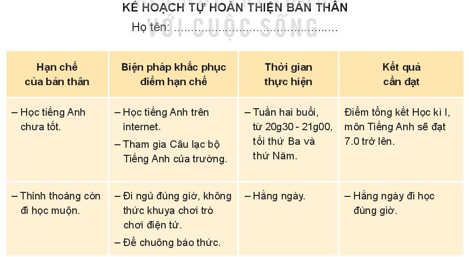 - Kiên trì rèn luyện theo kế hoạch tự hoàn thiện bản thân đã xây dựng.