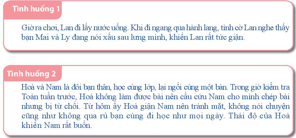 Tình huống 2: Chủ động tìm cách nói chuyện với Hòa để giải thích về lý do mình làm như thế đồng thời phân tích để Hòa hiểu được hành động đó là không đúng. Rủ bạn cùng ôn tập cho những bài kiểm tra sau.