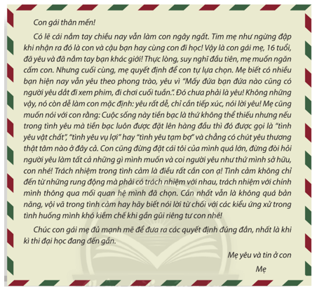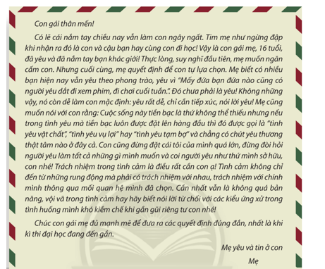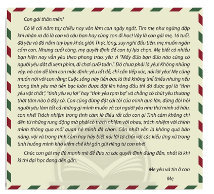 Suy nghĩ của em: Những ý kiến của người mẹ trong lá thư là những ý kiến rất hay và sâu sắc, thể hiện tâm tư của một người mẹ - một người đã từng trải dặn dò đứa con gái mới lớn của mình. Những ý kiến của người mẹ vừa thể hiện sự tôn trọng đối với tình cảm mới lớn của con gái nhưng cũng đồng thời khuyên con nên tỉnh táo và cẩn trọng một số chuyện trong tình yêu.
