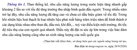Từ thông tin 1, em hãy cho biết sự gia tăng nhu cầu tiêu dùng năng lượng của người dân gây sức ép với môi trường như thế nào.