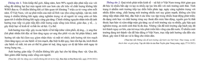 - Nội dung thông tin 1 cho biết: tình trạng ô nhiễm môi trường đã khiến cho chất lượng cuộc sống của con người bị suy giảm; đồng thời gây ra thiệt hại lớn về kinh tế và gia tăng tình trạng bất ổn trong xã hội.