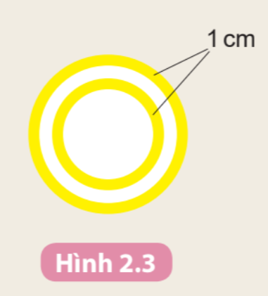 Làm mô hình nguyên tử carbon theo Bo Chuẩn bị: bìa carton, giấy màu vàng, các viên bi nhựa to màu đỏ và các viên bi nhỏ màu xanh. Tiến hành: Gắn viên bi đỏ vào bìa carton làm hạt nhân nguyên tử carbon. Cắt giấy màu vàng thành hai đường tròn có bán kính khác nhau và mỗi vòng tròn có độ dày khoảng 1 cm (Hình 2.3). Dán các đường tròn lên bìa carton sao cho tâm của hai đường tròn là viên bi đỏ. Gắn các viên bi màu xanh lên hai đường tròn màu vàng như Hình 2.2b Thảo luận nhóm và trả lời câu hỏi: 1. Các đường tròn bằng giấy màu vàng biểu diễn gì? 2. Em hãy cho biết số electron có trong lớp electron thứ nhất và thứ hai của nguyên tử carbon và chỉ ra lớp electron đã chứa tối đa electron |