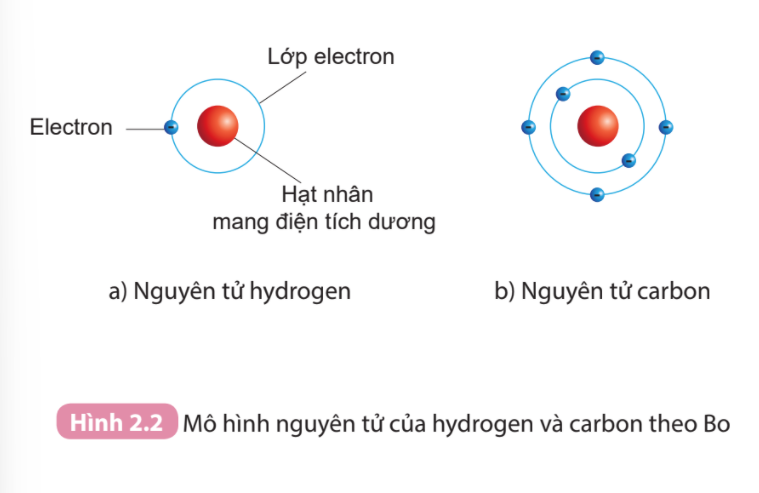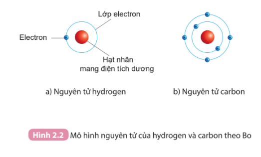 2. Quan sát Hình 2.2, áp dụng mô hình nguyên tử của Bo, mô tả cấu tạo của nguyên tử hydrogen và nguyên tử carbon