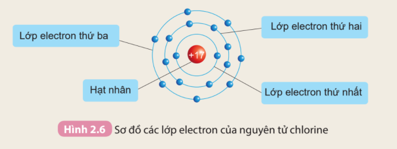 Quan sát Hình 2.6 và cho biết: 1. Thứ tự sắp xếp các electron ở vỏ nguyên tử chlorine 2. Số electron trên từng lớp ở vỏ nguyên tử chlorine