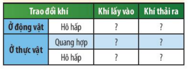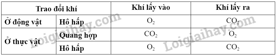 Hoàn thành thông tin về sự trao đổi khí ở động vật, thực vật trong bảng sau: