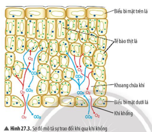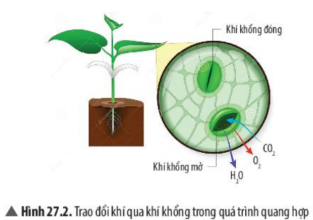 Câu 9: Quan sát Hình 27.3, hãy mô tả sự trao đổi khí diễn ra ở lá cây khi cây quang hợp và hô hấp.