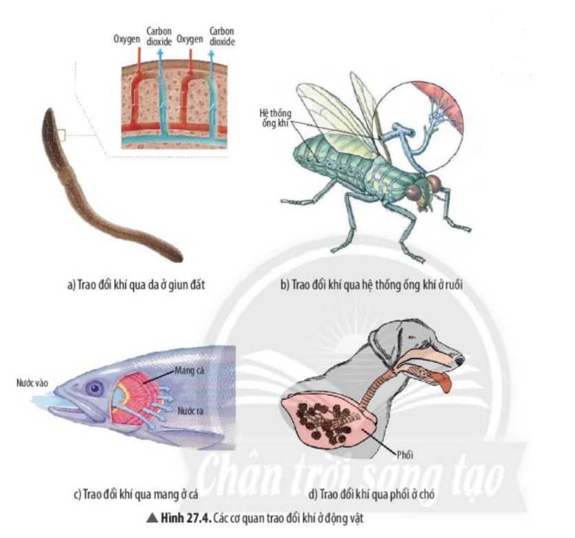 Câu 10: Kể tên các cơ quan thực hiện sự trao đổi khí ở động vật. Câu 11: Quan sát Hình 27.4, hãy cho biết các đại diện: giun đất, ruồi, cá, chó trao đổi khí qua các cơ quan nào.