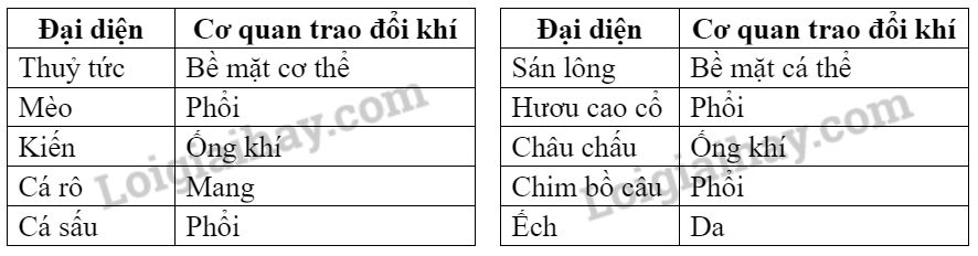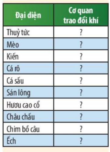 Xác định các cơ quan trao đổi khí của các sinh vật trong bảng sau: