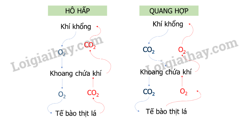Câu 1: Sơ đồ mô tả đường đi của khí qua khí khổng ở lá cây trong quá trình quang hợp và quá trình hô hấp.