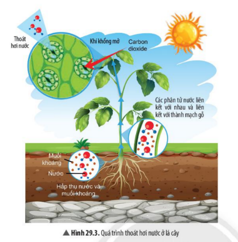 Câu 5: Dựa vào Hình 29.3, hãy trả lời các câu hỏi sau: a) Tại sao vào những ngày trời nắng, đứng dưới bóng cây lại thấy mát? b) Nhờ lực hút hay lực đầy mà quá trình thoát hơi nước qua khí khổng có thể giúp các chất được vận chuyển trong mạch gỗ một cách dễ dàng? c) Nếu cây không thoát hơi nước thì cây có lấy được khí carbon dioxide không? Vi sao? d) Em hãy cho biết những vai trò của quá trình thoát hơi nước đối với cây.